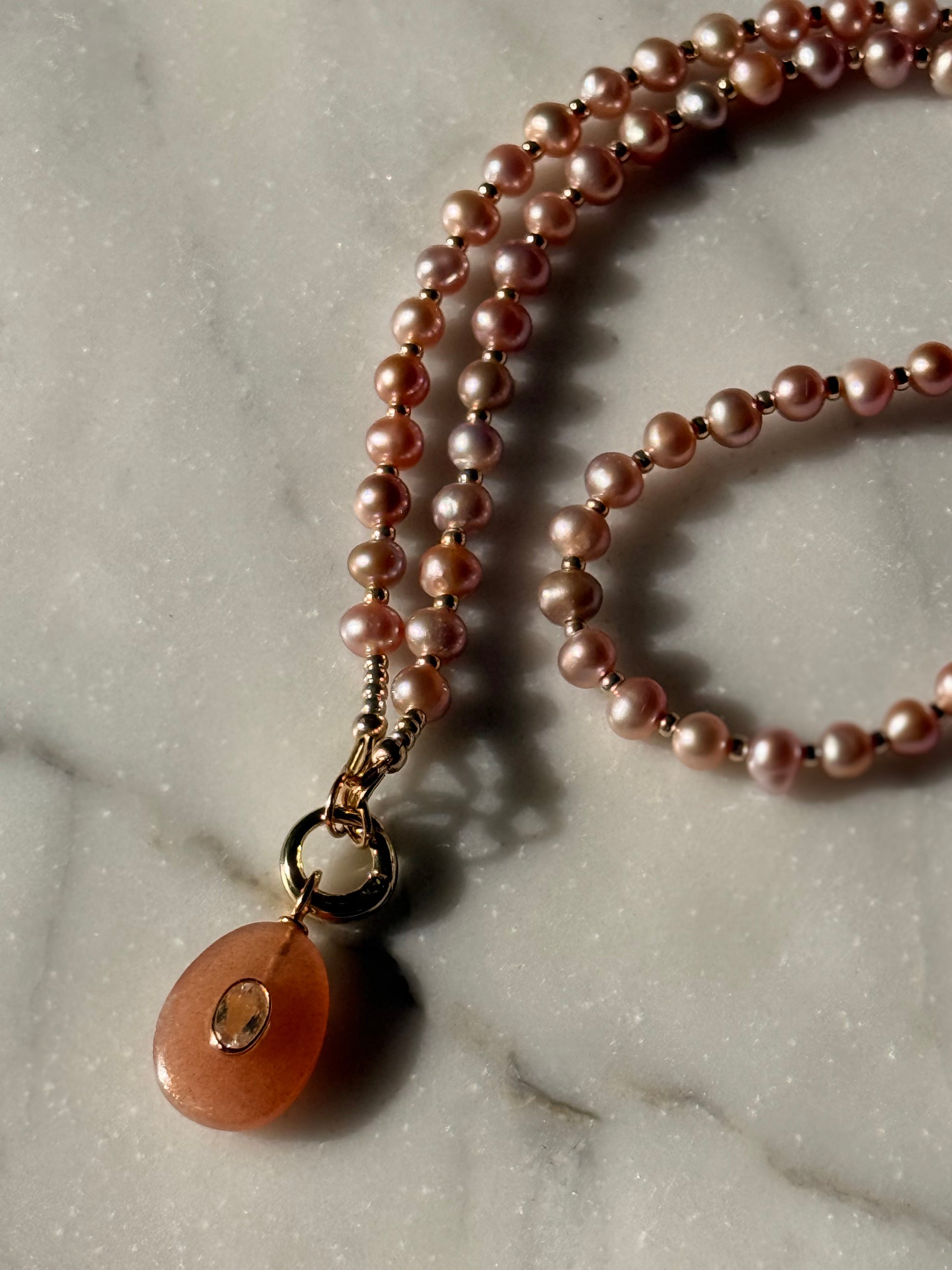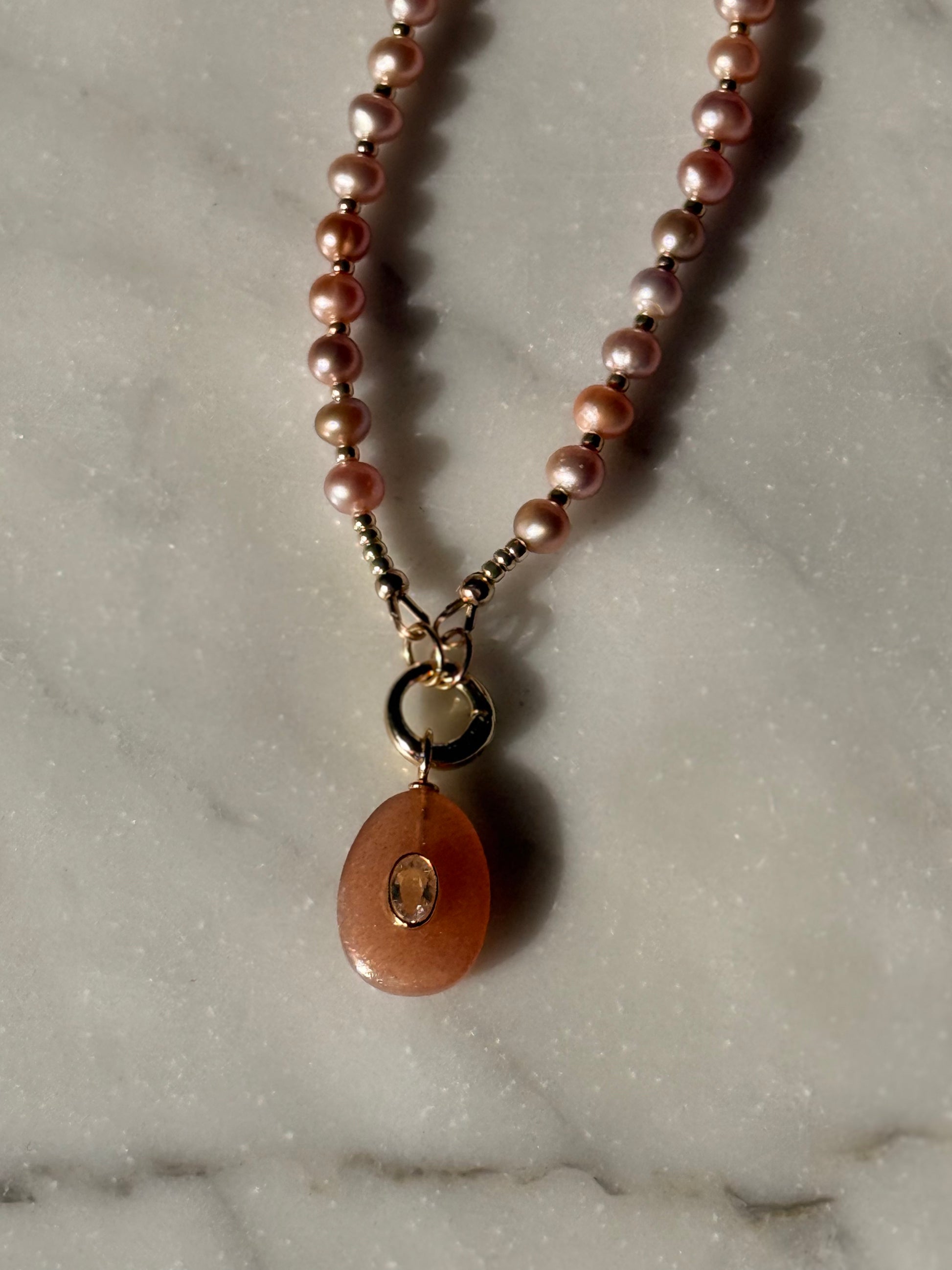 Gold-filled and timeless, this necklace features soft pink pearls and a luminous sunstone pendant. A perfect balance of blush and golden light, made for everyday wear with a touch of glow.