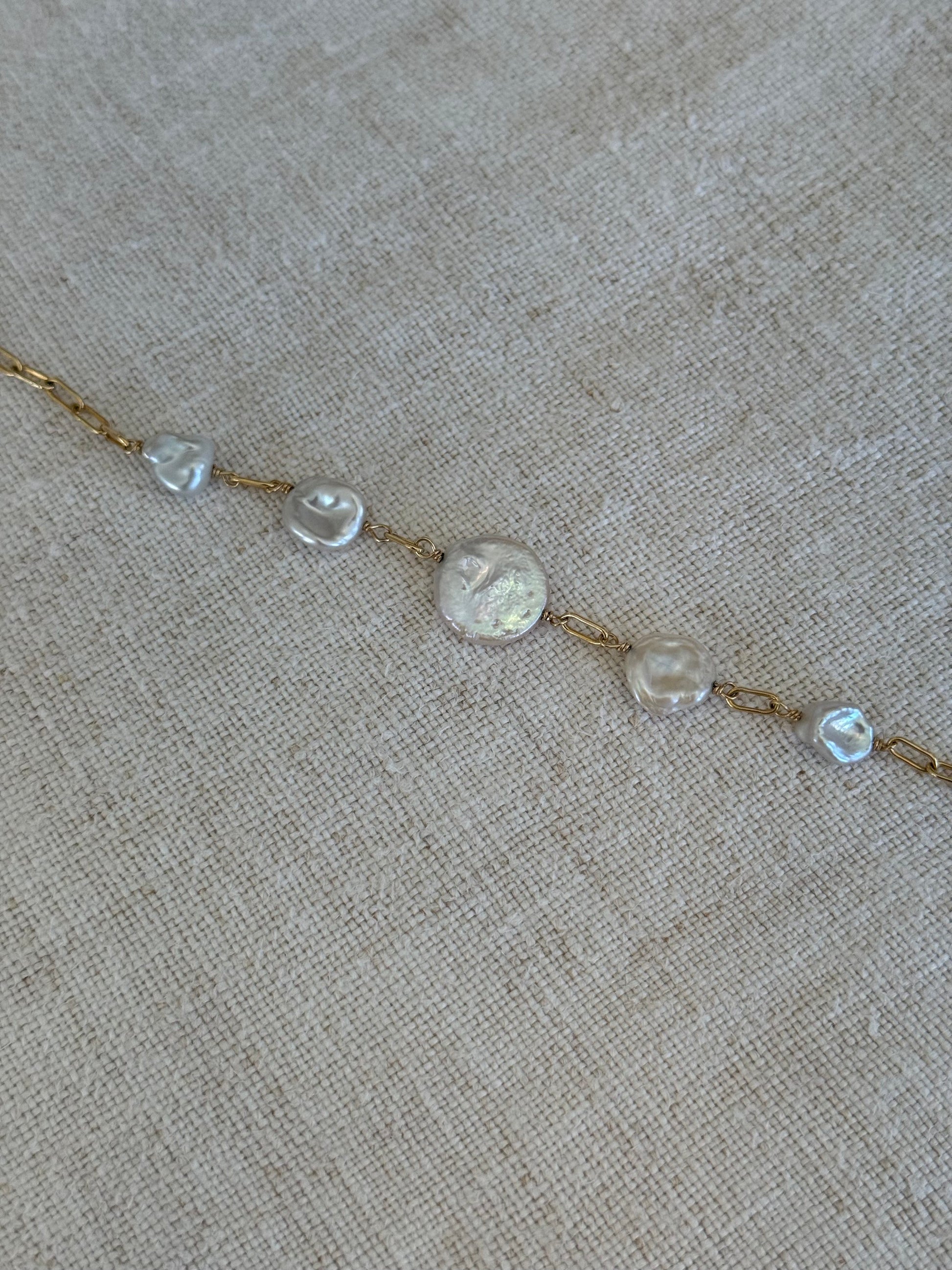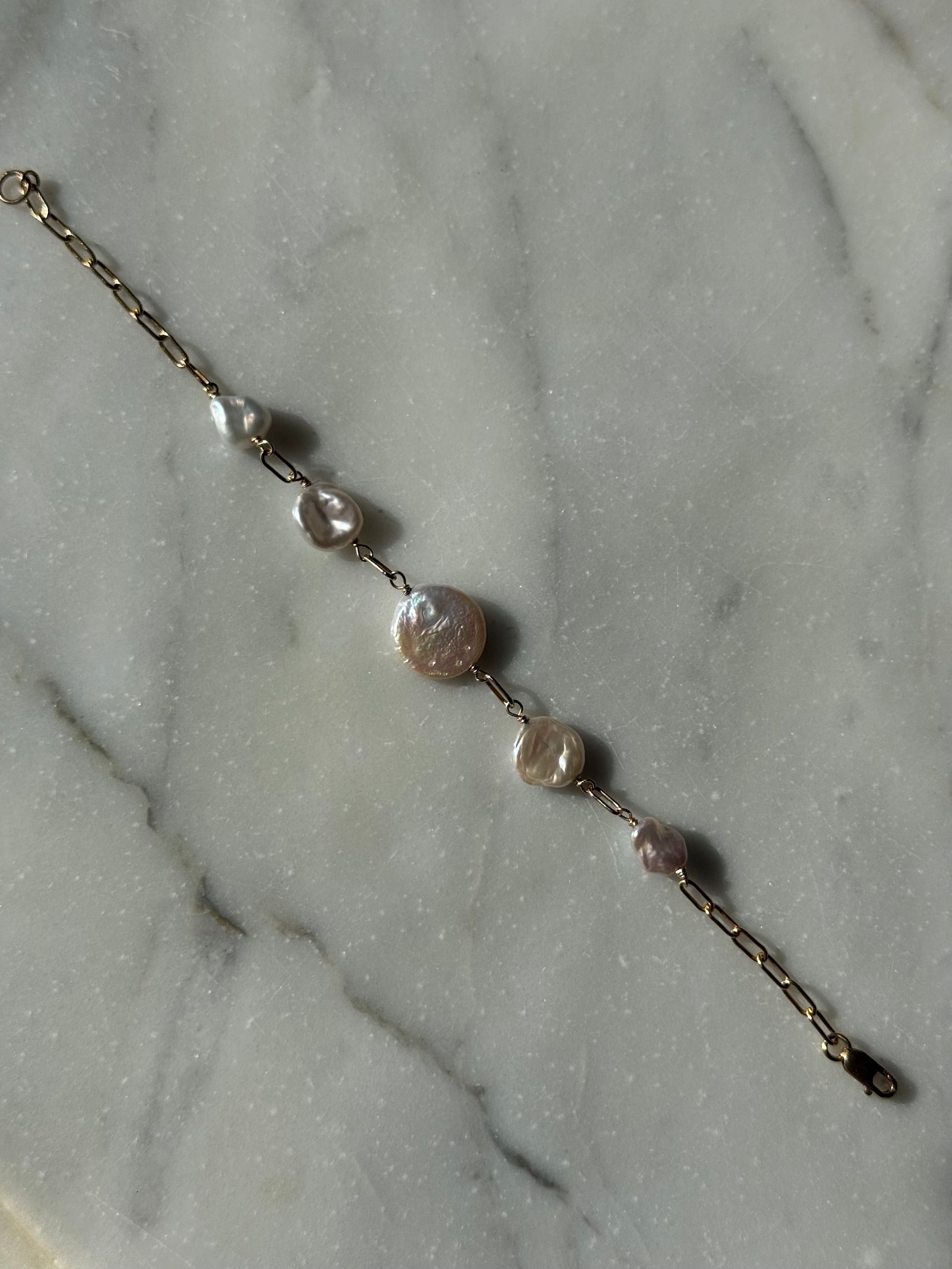 Crafted with a gold-filled paperclip chain and a single coin pearl, this bracelet is understated and elegant. A versatile staple that adds just the right touch of softness and shine.