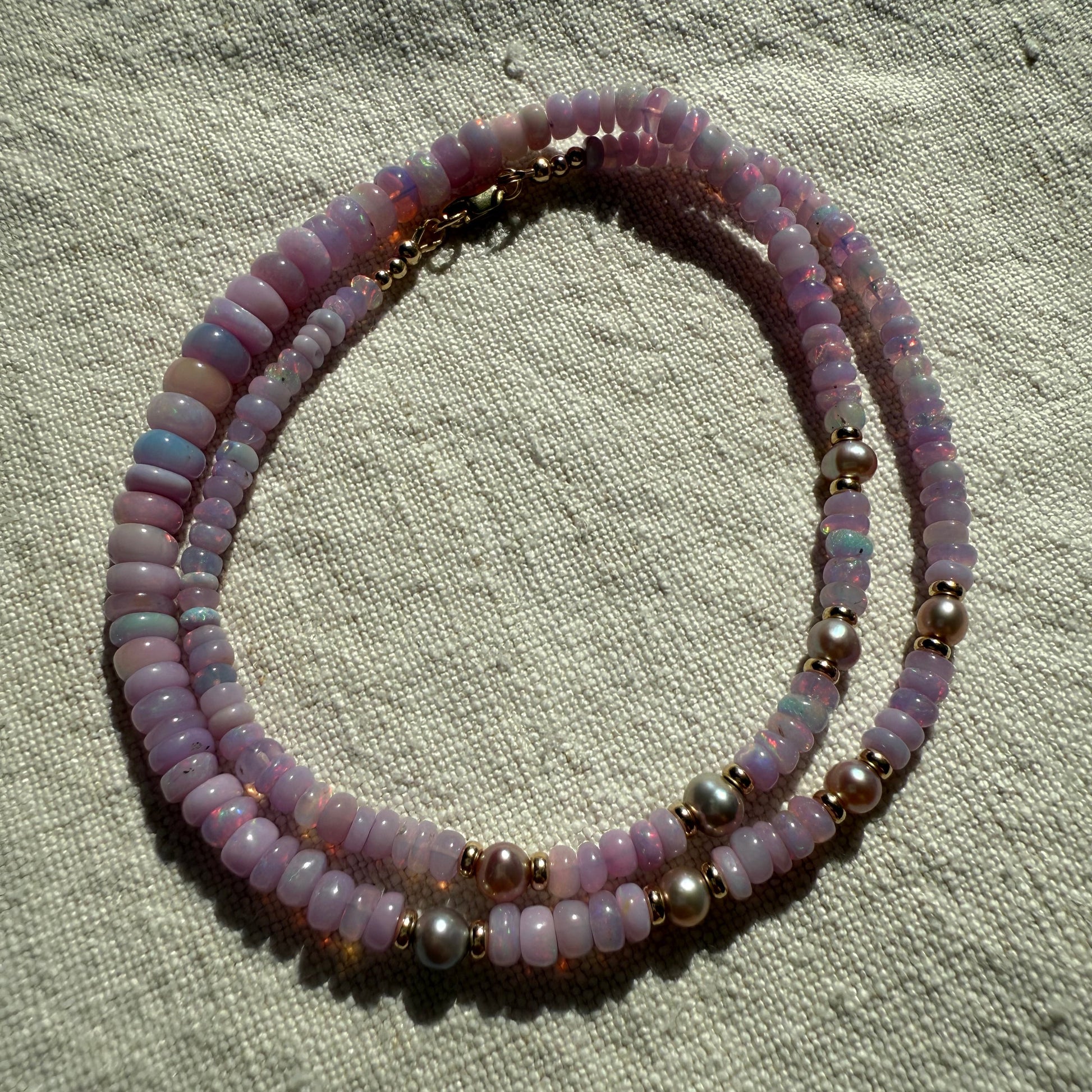 This charming necklace combines real lavender Ethiopian opals with 14k gold-filled beads and natural pink pearls, creating a piece that’s both adorable and sophisticated. The iridescence of the beads shine beautifully when it catches the sunlight.