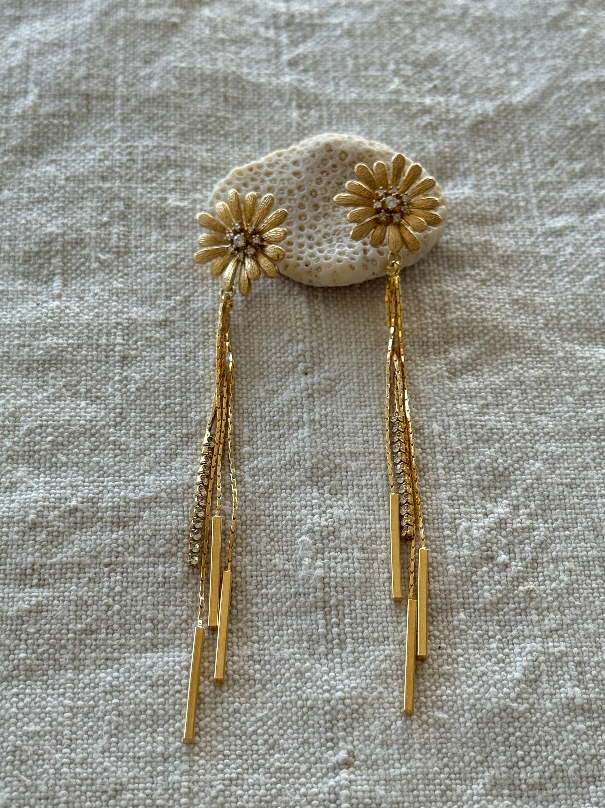 Cascade de Marguerite — a golden daisy anchors this luminous cascade of sparkling drops. With a glimmering center and soft movement that catches the light, these earrings bloom with effortless elegance.